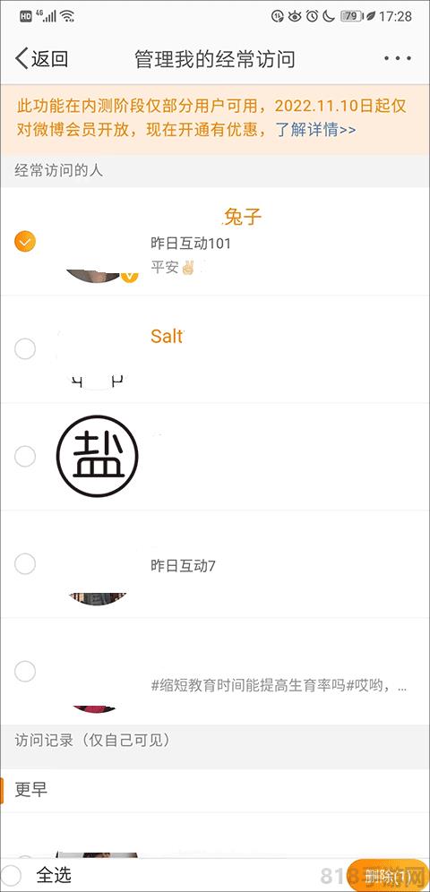 4、如果您是會員用戶,您有權比其他用戶更多地刪除訪客記錄。用戶只需選擇需要刪除的訪問記錄,單擊右下角的“刪除”選項即可完成刪除。